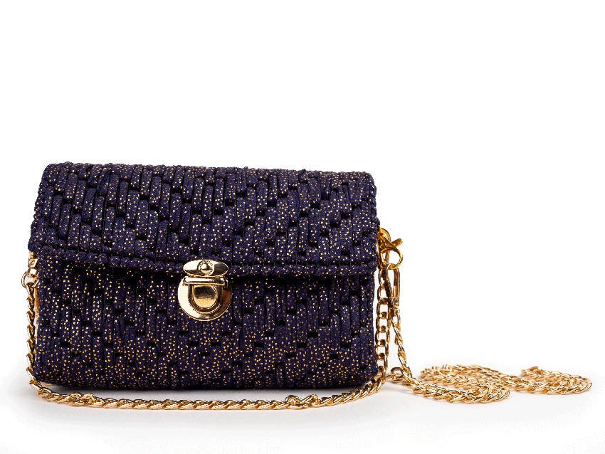 Brilla con la elegancia de la noche. El bolso MIDNIGHT GLOW combina un tejido azul profundo con destellos dorados que evocan un cielo estrellado. Su cierre metálico dorado y la cadena a juego lo convierten en el aliado perfecto para tus eventos más especiales. Compacto, sofisticado y lleno de luz, este bolso está hecho para robar miradas sin decir una palabra.