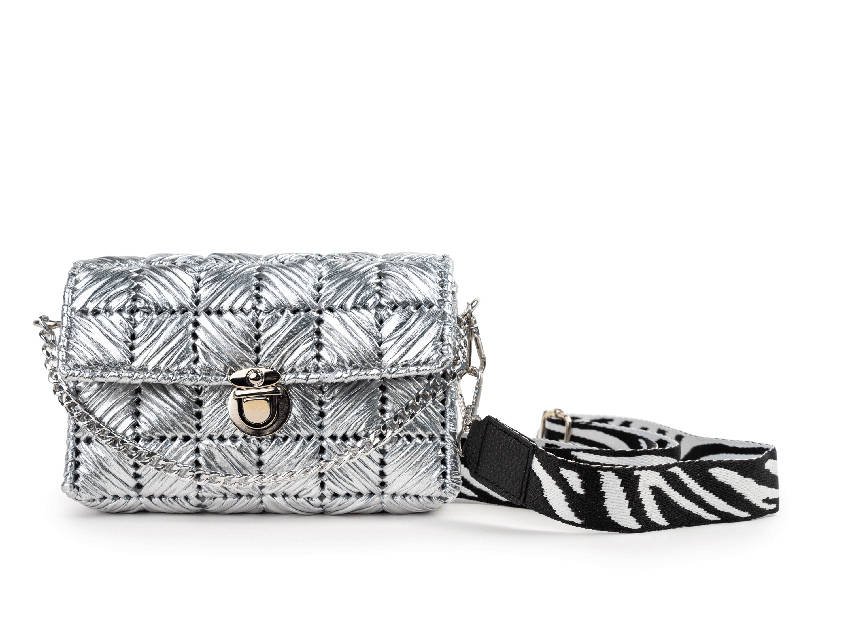 SILVER BEAT es el accesorio perfecto para quienes viven con estilo y sin límites. Su tejido plateado con textura acolchada refleja la luz con cada movimiento, mientras que el cierre metálico y la cadena en plata le aportan ese toque sofisticado. La correa ancha en estampado cebra lo convierte en una pieza atrevida, cómoda y versátil, ideal para looks urbanos con carácter. Un bolso que late al compás de la ciudad.